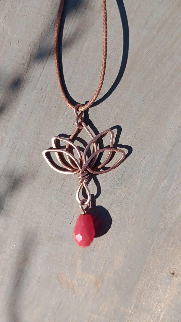 Colar com delicado pingente de cobre modelado e martelado artesanalmente em formato de flor de Lótus decorado com gota de cristal de cor goiaba. Uma peça versátil que vai dar um charme a mais a qualquer look.
