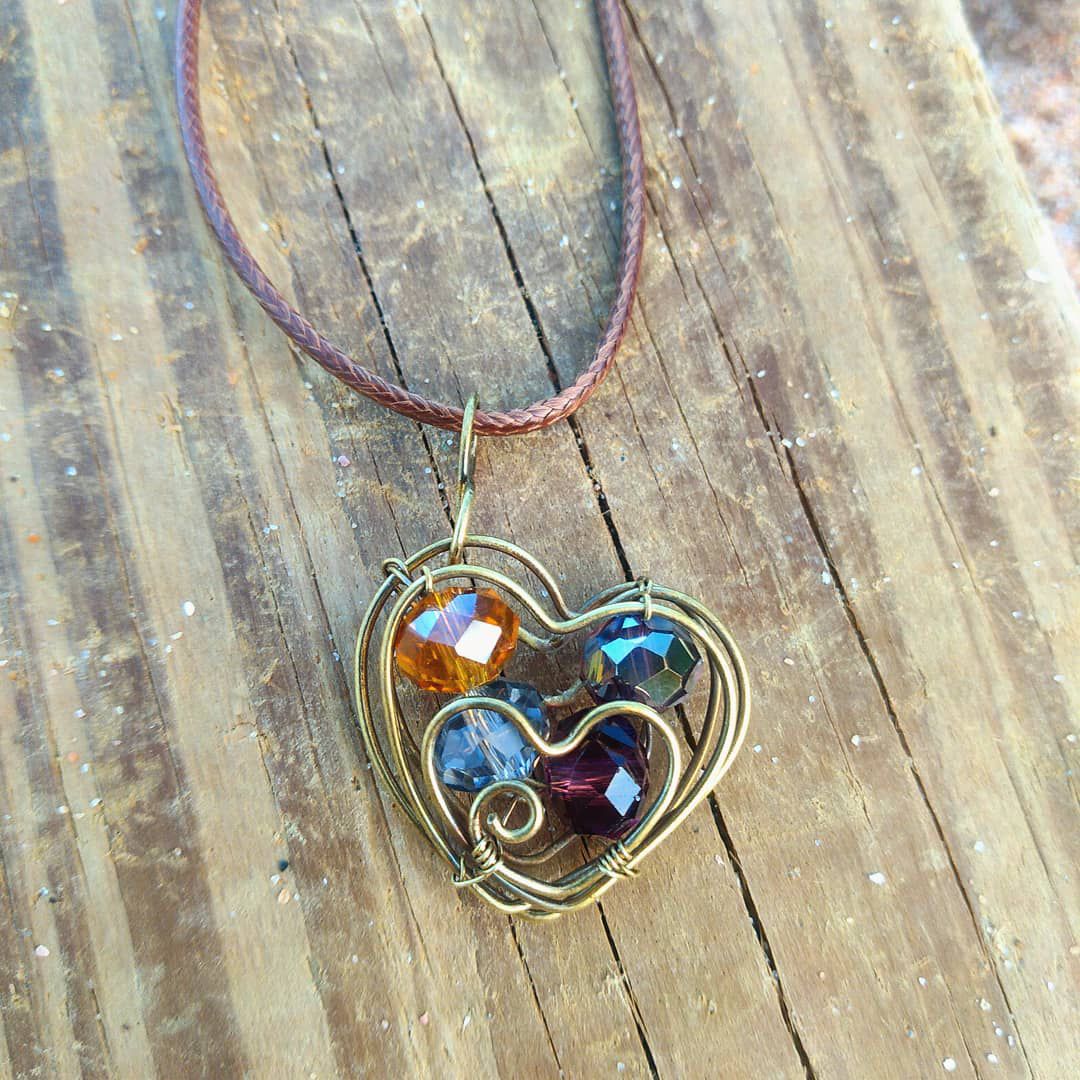Colar colorido e gracioso com pingente de latão cor ouro velho todo modelado à mão em formato de coração, com cristais coloridos em seu interior.