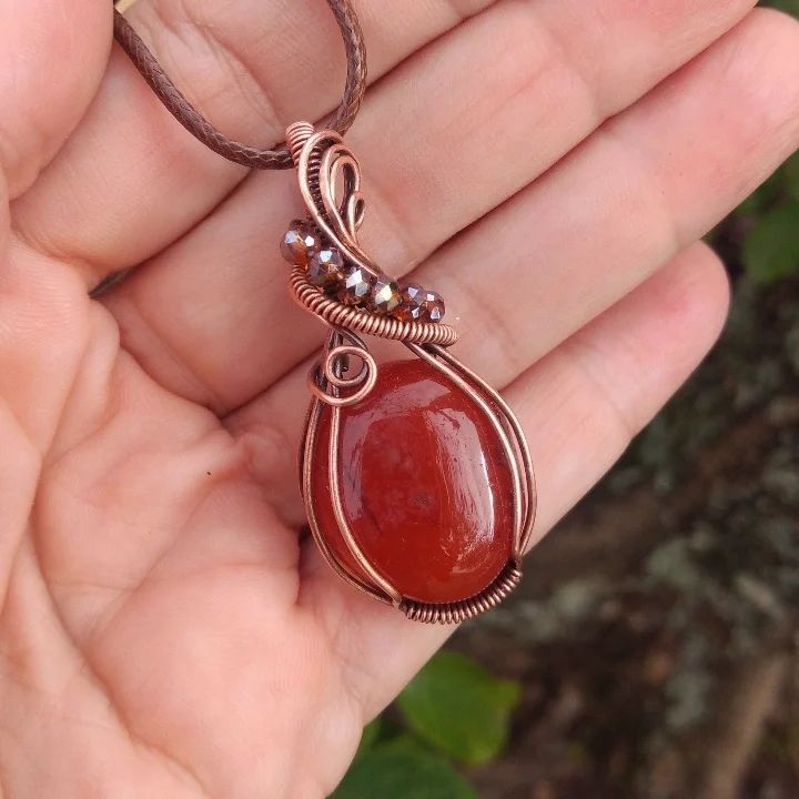Colar com lindissimo pingente de pedra natural Cornalina trabalhado artesanalmente em fio de cobre envelhecido e decorado com mini cristais. Acompanha cordão encerado marrom de excelente qualidade com fechamento em macramê que permite ajuste do comprimento.