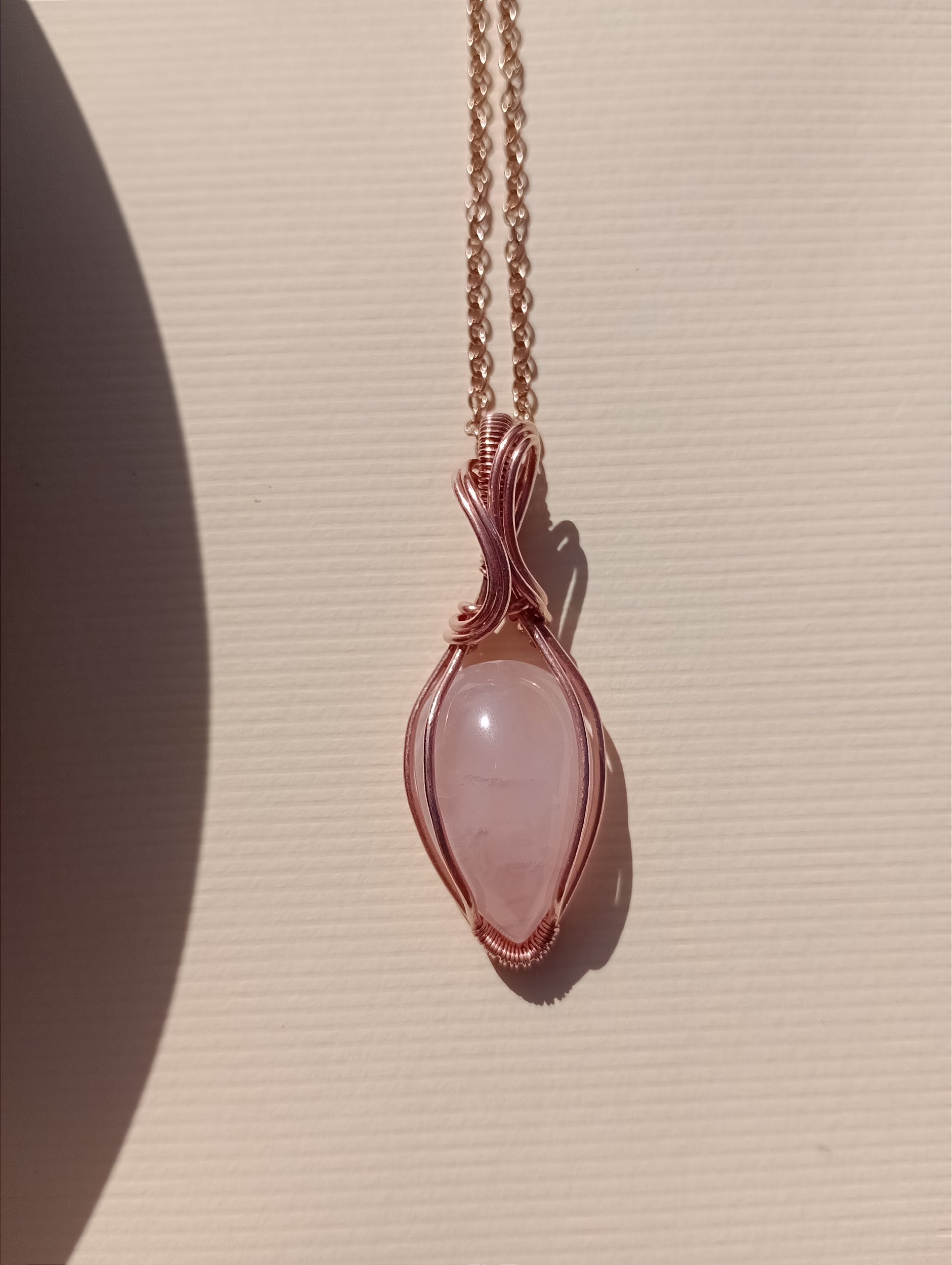 Delicado colar com pingente de cabochão de Quartzo Rosa trabalhado na técnica de wirework em fio de cobre polido.