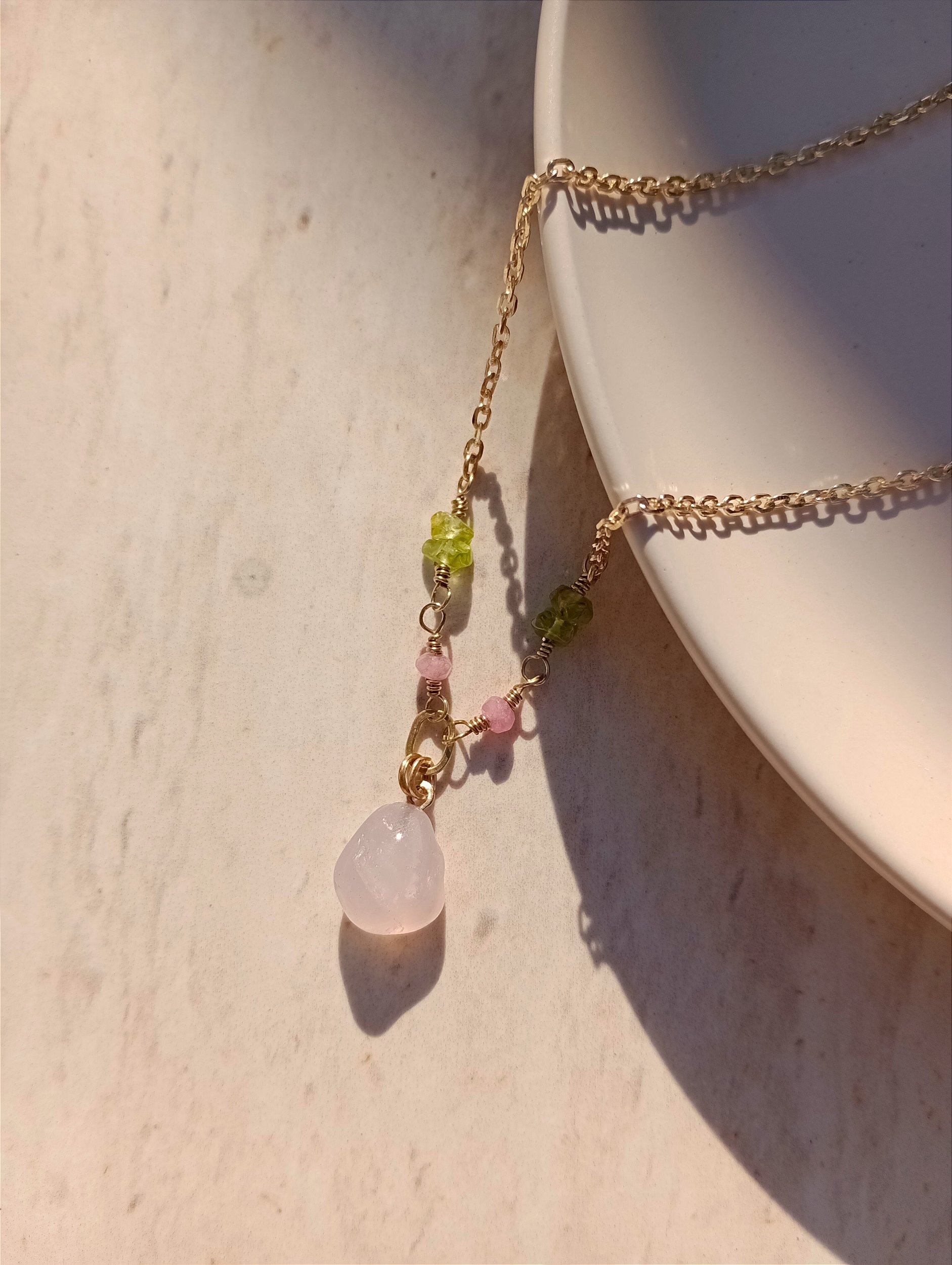 Graça e delicadeza descrevem esse colar que trás belas pedras naturais, cores suaves e um trabalho impecável em Nó de Joalheiro.